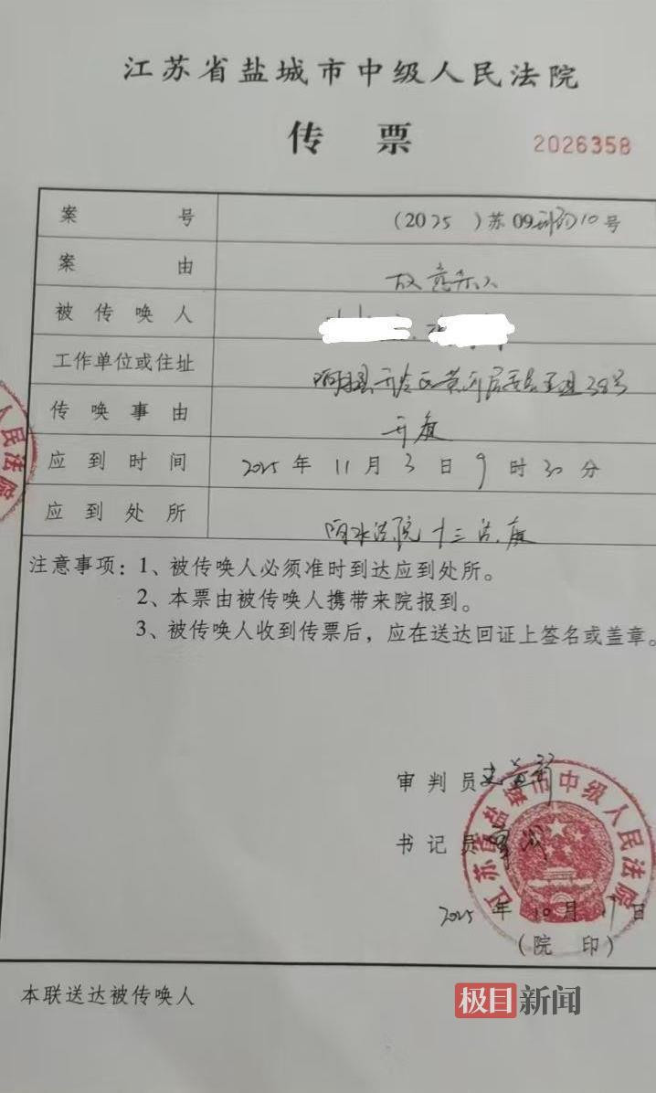 在盐城市中级人民法院发给张女士的开庭传票上,极目新闻记者看到,案由写的是“故意杀人”。
